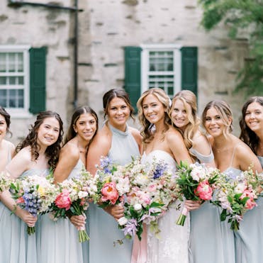 An aisle graced with the season’s purest bright white flowers with a backdrop of emerald and sage green foliage set the tone for Stef and Chris’s elegant soiree. Not to be out done, their dog Bella helped get the party started as she greeted guests at the ceremony - with a floral embellishment on her collar, of course! Their wedding featured a mix of round and rectangular tables highlighting various tall centerpiece styles with crystal and glass elements sparkling in the spring sun under the grand clear top Water Works tent.