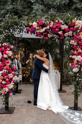 This couple did not shy away from color! The bride loves pink so we decided to incorporate a bold, monochromatic palette to contrast against ivory linens and the Horticulture Center’s unique backdrop of lush greenery - creating celebratory pops of color throughout the venue. Unique hanging installations of lush florals, greenery, rattan lanterns, and Edison bulbs coordinated beautifully with the illumination of pink taper candles below.